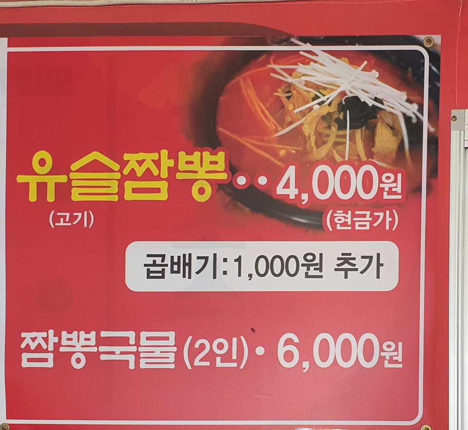 유슬짬봉 4000원, 짬뽕국물 2명 이상 계셔야 주문이 가능하고, 현금가입니다. 곱빼기는 1000원 추가예요