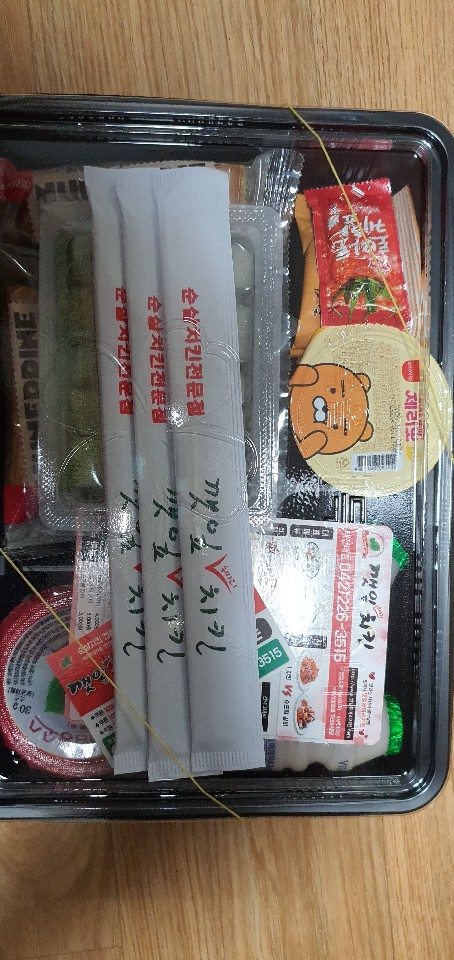 #깻잎치킨 기본적으로 주는 메뉴에요 ㅎㅎ 기본적으로 과자 두개도 넣어주시고 요구르트2개, 치밥용소스, 제라뽀젤리 등등 넣어줘요 ㅎㅎ 서비스도 최고최고!!
