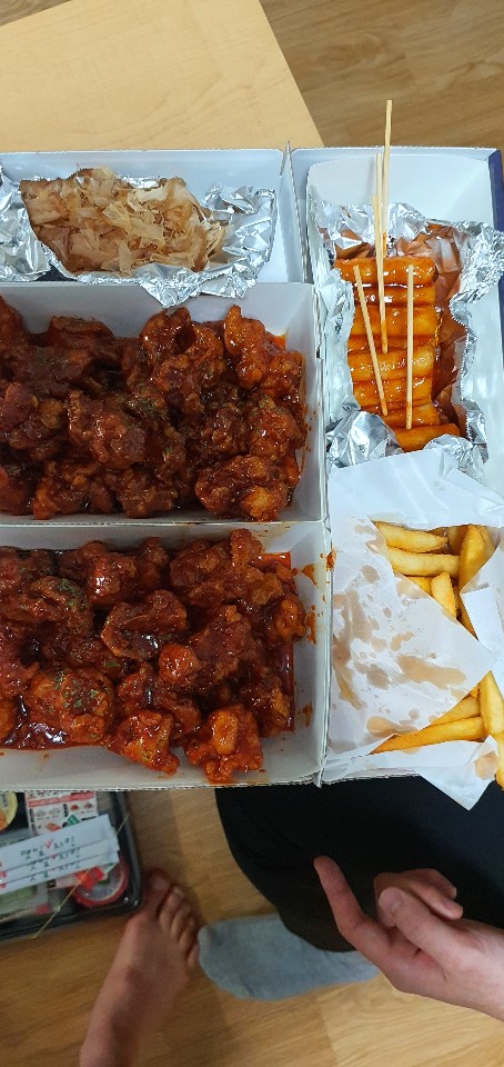 #깻잎치킨 기본적으로 감자튀김이랑 타코야끼 떡꼬치 3개를 넣어줍니다 ㅎㅎㅎ 따끈따끈하게 잘 먹었어요 ㅎㅎㅎ