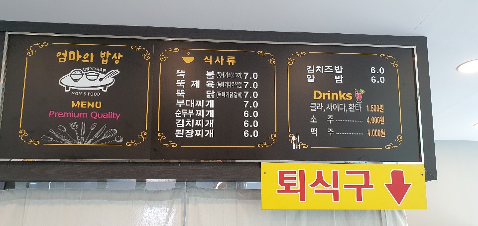 #엄마의밥상 가게 안에서 확인하실 수 있는 메뉴예요. 식사류는 밖에서 보시는 것과 같이 똑같고, 음료는 콜라, 사이다, 환타가 1500원에 각각 판매 중이고, 소주, 맥주는 각각 4000원이에요.