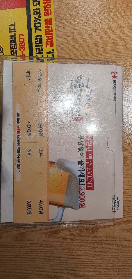 생맥주500cc 2900원, 병맥주 4000원, 소주 4000원, 청하 5000원 입니다.