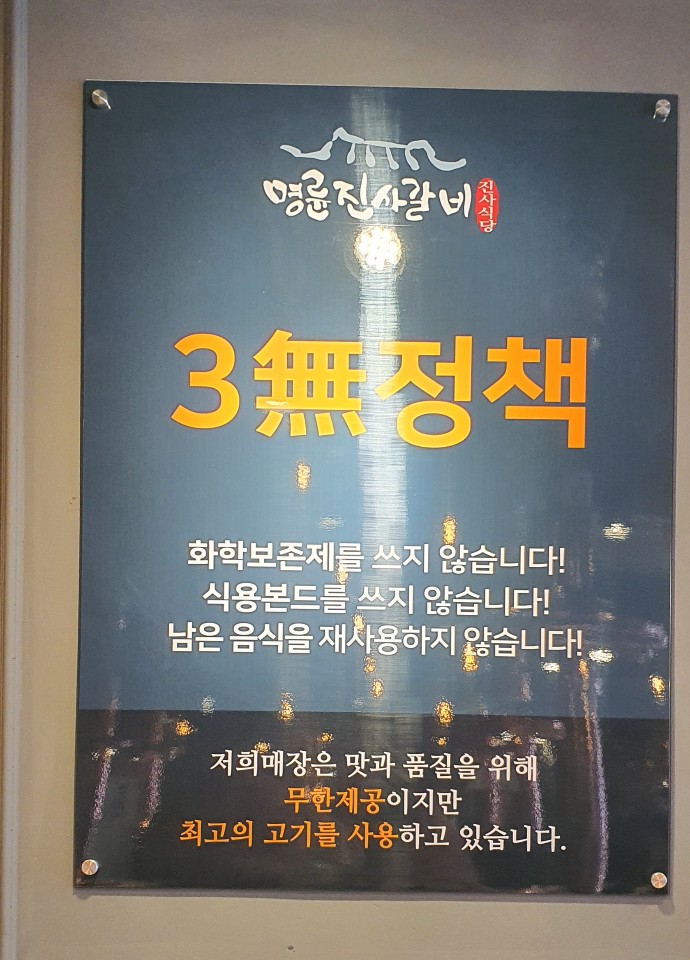 #명륜진사갈비 3無정책으로 화학보존제, 식용본드, 남은음식 재사용을 하지 않는다고 합니다.