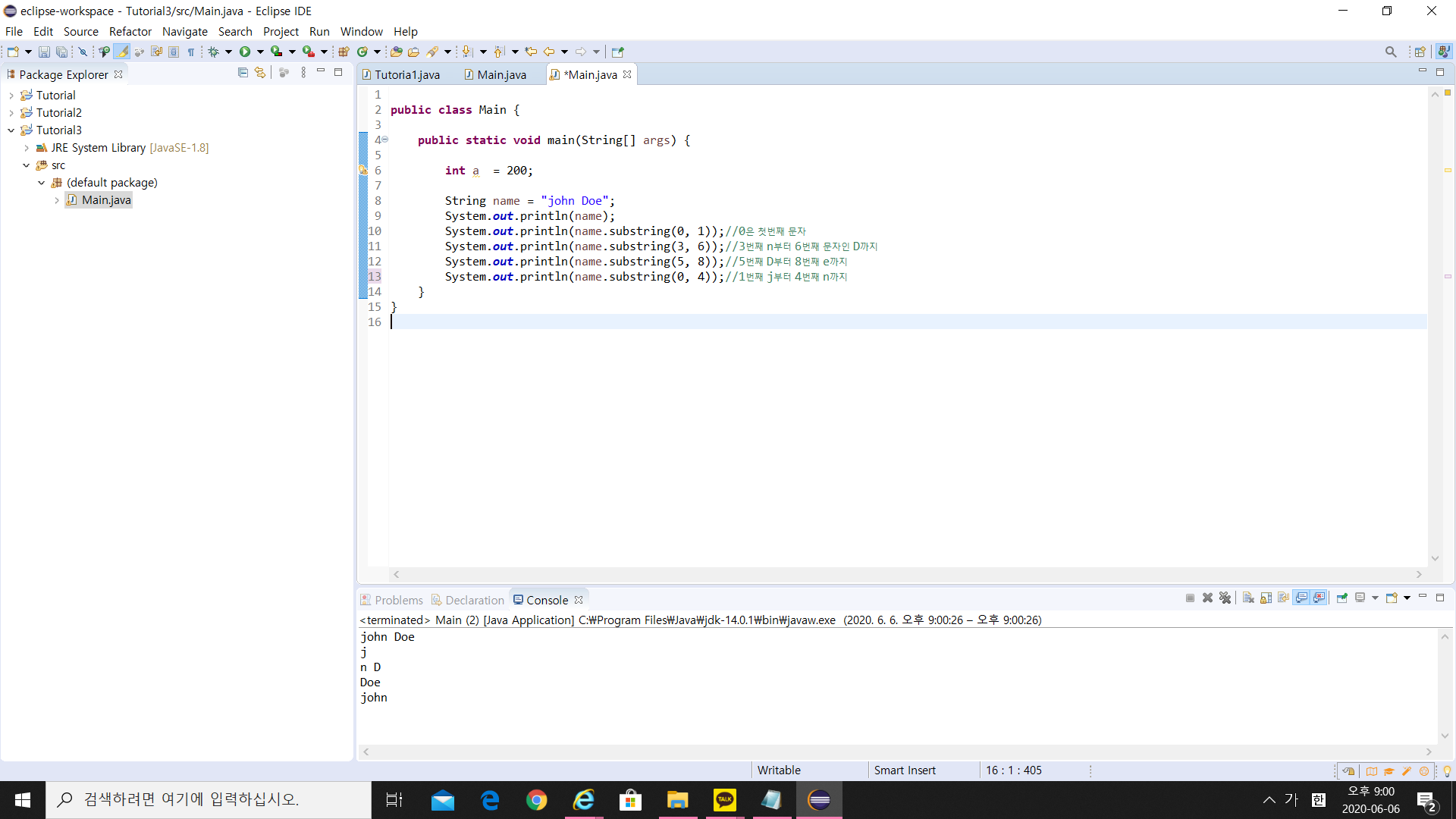 그리고 그 뒤에 substring를 0, 1로 해주시면 j가 선언되고, 3, 6은 n, D로, 5, 8을 선언하면 Doe로 출력이 됩니다.