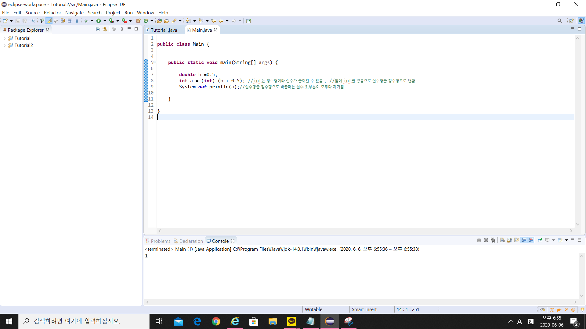 int위에 double b를 0.5로 선언하여 int a = 0.5에 b를 더해주면 1.0이 되는 것을 결괏값이 나옵니다