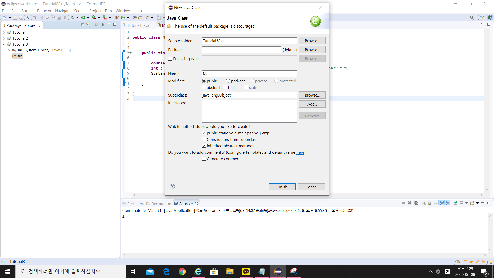 class name을 Main으로 작성하고, public static void main(String [] args)를 클릭하고 finish를 클릭해줍니다.