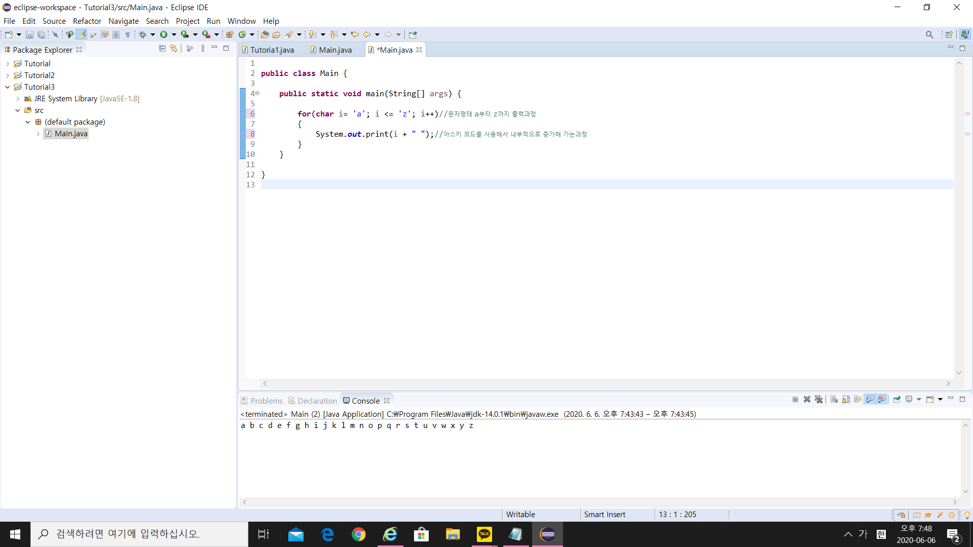 2. 아스키코드 기반의 char형을 사용해 a부터 z까지 출력하는 프로그램을 작성을 하는 방법을 알아보겠습니다.