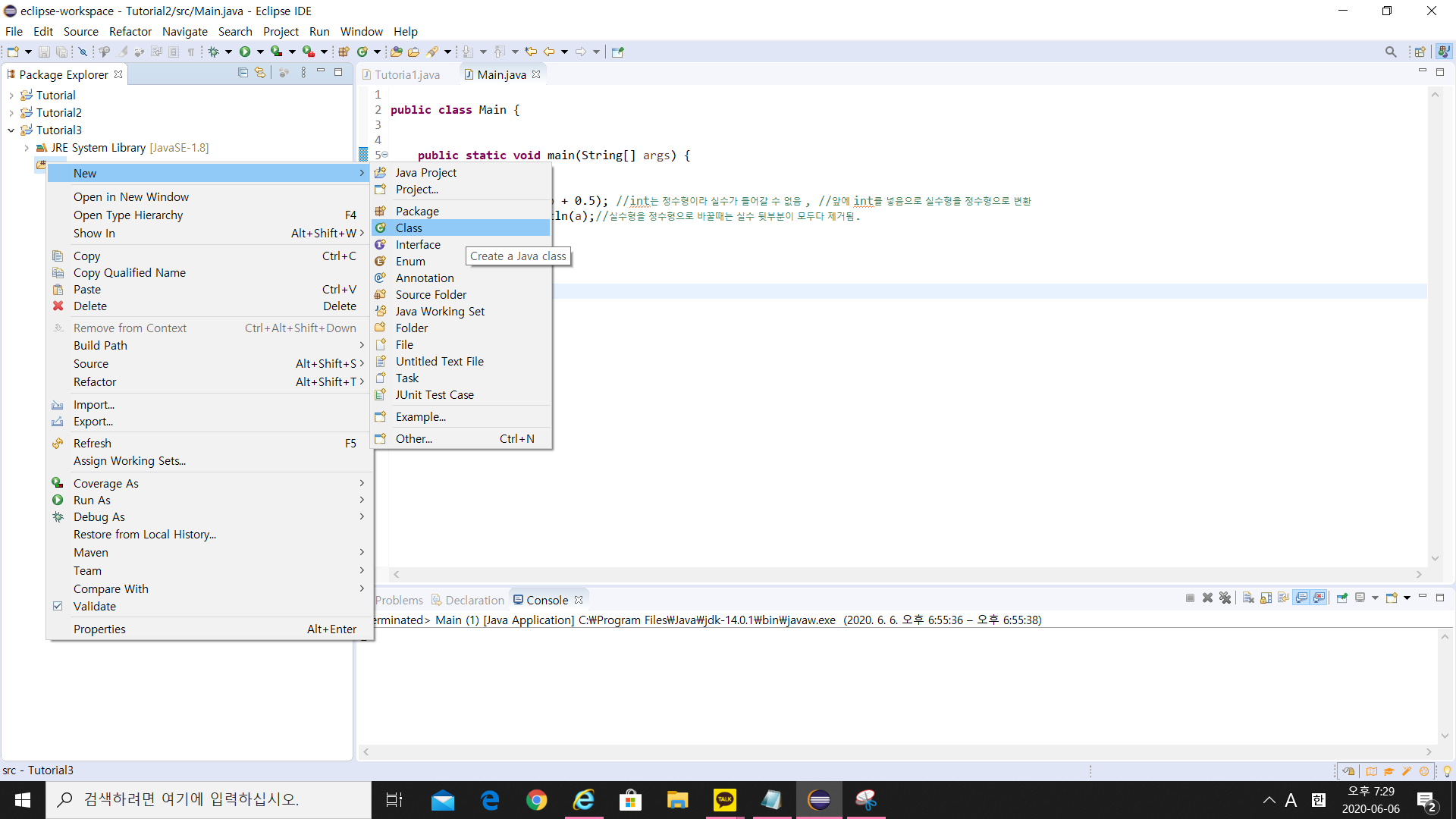 project를 생성 후 src에 class를 생성해줍니다.