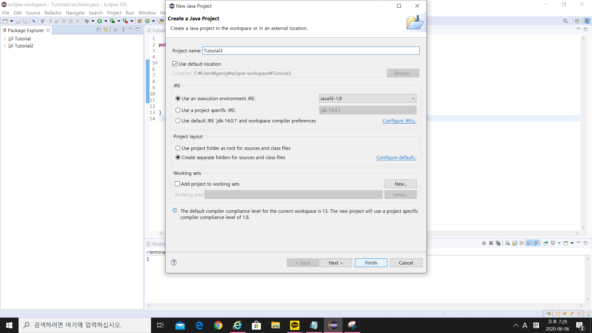 Tutorial3으로 project name를 설정해주고 finish를 클릭해줍니다.