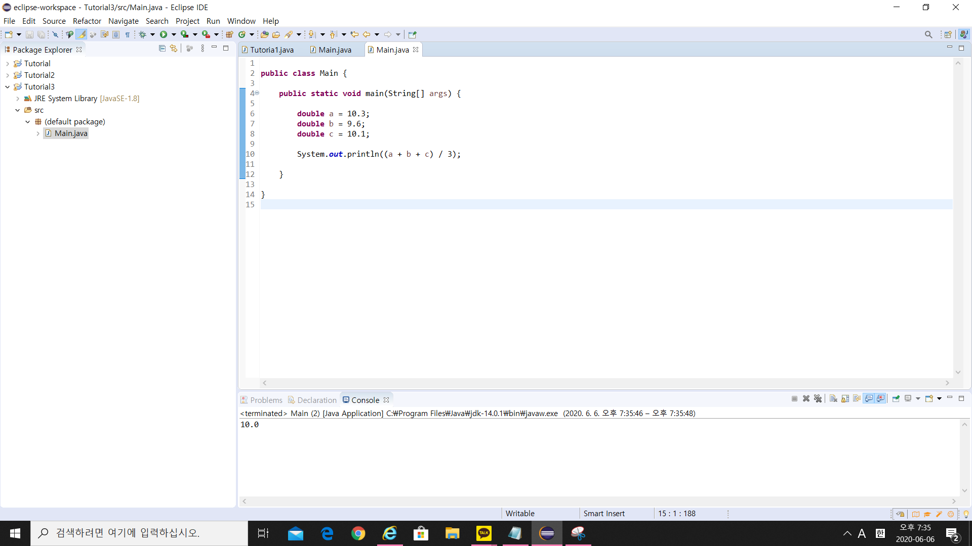 double a를 10.3으로, b를 9.6으로, c를 10.1로 선언하고, a + b + c를 더해주고 / 3을 출력을 해주면 10.0이 출력됨을 확인할 수 있습니다.
