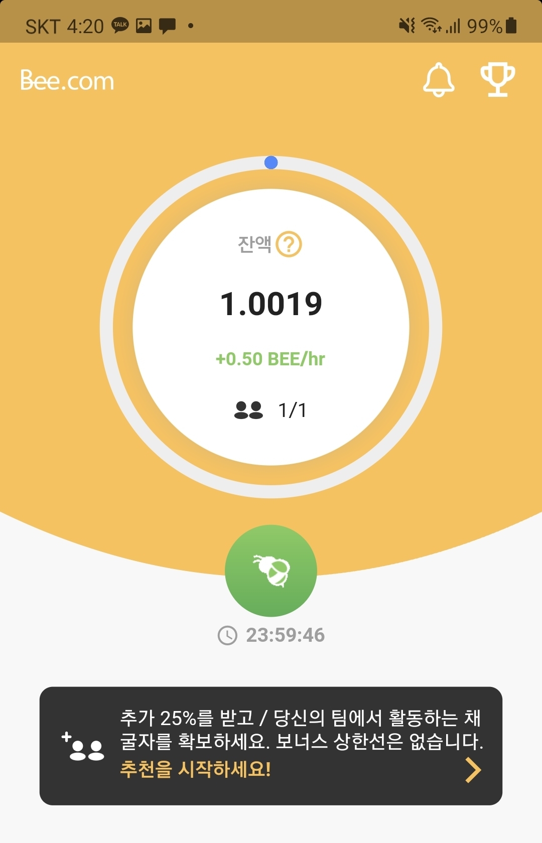 채굴하기 버튼을 클릭하시면 24시간 채굴이가능하며