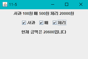 예제 11-5. 다음 그림과 같이 세 과일에 대해 각각 체크박스를 만들고, 사용자가 과일을 선택하거나 해제하면 바로 선택된 과일의 합산을 보여주는 응용프로그램을 작성하라.