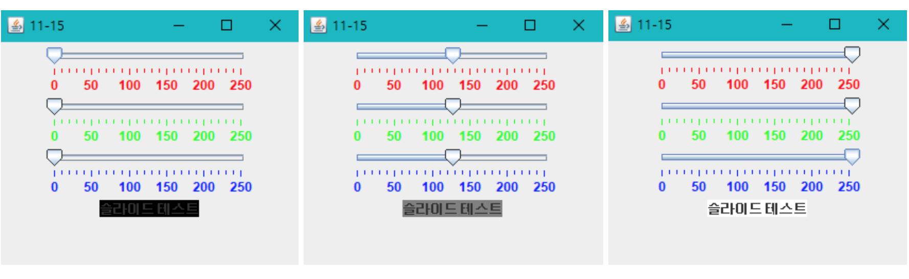 예제 11-15. 다음 그림과 같이 JSlider를 이용하여 3개의 슬라이더를 만들고, 각 슬라이더는 색의 구성 요소인 r(red), g(green), b(blue) 값을 선택하는데 사용하라. 사용자가 선택한 r,g,b 값을 조합하여 레이블의 배경색으로 출력하라.