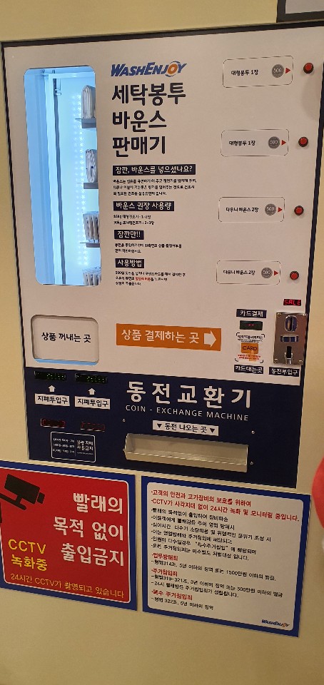 셀프빨래방 중앙에 충전기 옆에 위치하고 있으며, 대형봉투=1장, 다우니 바운스=2장 500원입니다