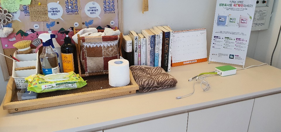 셀프 코 인방에서 지산점워시엔조이셀프빨래방에서 빨래 기다리면서 스마폰 만지시는 분이 많으신데 입구 바로 옆에 보시면 책하고 스마트폰 충전기 및 물티슈 휴지 등등이 같이 있어요 필요하시면 쓰시면 됩니다.