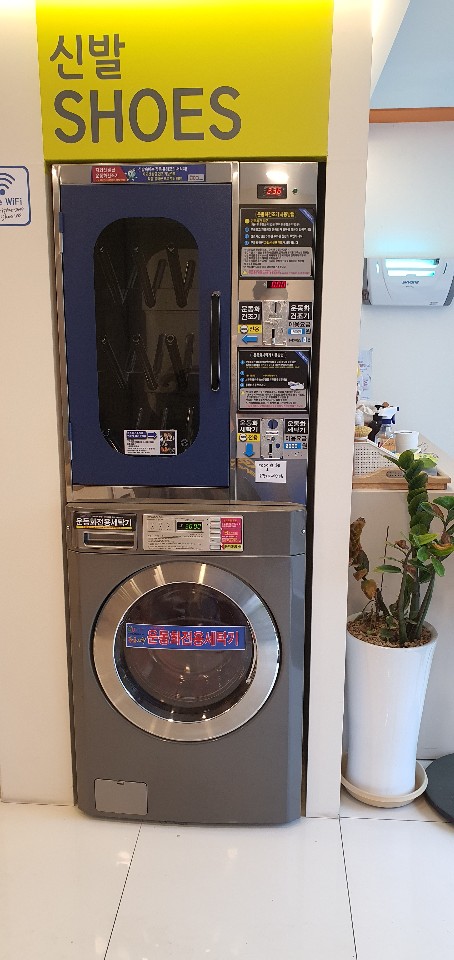 #지산점워시엔조이셀프빨래방 신발을 세탁하는 세탁기가 따로 배치되어있습니다. 입구에 들어서면 충전기가 있는 라인에 바로 앞에 배치되어있습니다.