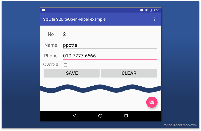 각 필드에 값을 입력하고 "SAVE" 버튼을 누르면, 입력된 값들이 데이터베이스에 저장됩니다. 그리고 앱을 다시 실행하면, 데이터베이스에 저장된 값이 화면에 표시되는 것을 확인할 수 있습니다.