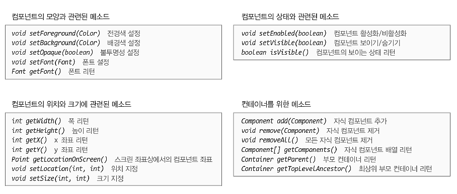 스윙 컴포넌트 의 공통 메소드, JComponent는 컴포넌트의 모양, 상태, 위치, 크기에 관련된 메소드와 컨테이너를 위한 메소드가 있다.
